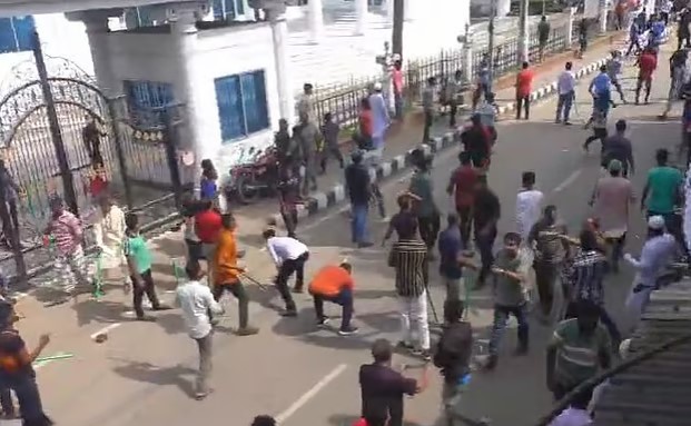 প্রত্যক্ষদর্শীরা জানান, দুপুর সাড়ে ১২টার দিকে নতুন বাজারে বিজেপি জেলা কার্যালয়ের সামনে পাল্টাপাল্টি ধাওয়া ও ইটপাটকেল নিক্ষেপের ঘটনা ঘটে। একপর্যায়ে নতুন বাজার থেকে প্রেসক্লাব পর্যন্ত এলাকা রণক্ষেত্রে পরিণত হয়। সংঘর্ষে বেশ কয়েকটি গাড়ি, দোকান ও রাজনৈতিক দলের পোস্টার–ব্যানার ভাঙচুর করা হয়।